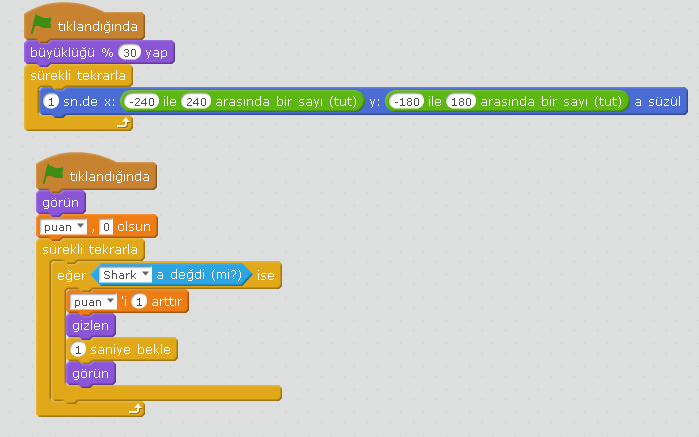 İlk kod bloğunda rastgele ekran sahnesine gitmesini sağladık. Yüzme efekti versin diye de süzül kodunu kullandık. İkinci kısımda ise shark balığına değme durumunda neler olacağına dair gerekli işlemleri yazdık.